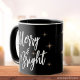 Feliz e Black Dourado Estrela Elegante de Natal. Uma caneca de ouro preto e giro com a citação de Natal "FELIZ E BRIGHT" escrita no estilo bonito da tipografia. Presente perfeito nesta temporada de férias. Para qualquer personalização, entre em contato comigo em mypaperlove2021@gmail.com