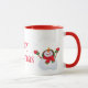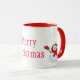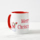 Café/chá/caneca de cacau cerâmico é mostrado com um festivo impressão de arte de Natal com "Feliz Natal" no texto. Impressão de boneco de neve nos dois lados da caneca. Personalize este item ou comprar como está.