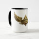 Drink from a vessel of ancient mystery and modern design. This premium two-tone combo mug features a crisp white exterior adorned with the signature NeoAnkh 3D-effect masterpiece: the Eye of Horus and the Winged Solar Disk over the eternal Pyramids of Giza. The metallic gold textures are rendered with hyper-realistic depth, popping vividly against the white ceramic.