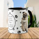 Um Cachorro Pug adorável olha para você de dois lados desta caneca. O texto entre as duas imagens diz "No oitavo dia, Deus criou o PUG e o chamou de MUITO BOM". As imagens do cão e o banner branco oval que contém os campos de texto são colocados sobre um fundo branco com impressões de pata preta. Bonita!