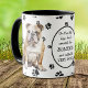 Um Bulldog Inglês marrom e branco olha para você de dois lados desta caneca. O texto entre as duas imagens diz "No oitavo dia, Deus criou o BULLDOG e o chamou de MUITO BOM". As imagens do cão e o banner branco oval que contém os campos de texto são colocados sobre um fundo branco com impressões de pata preta. Um presente perfeito para quem ama Bulldog!