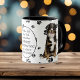 Um lindo Cão da Montanha Bernese olha para você de dois lados desta caneca. O texto entre as duas imagens diz "No dia 8, Deus criou o Cachorro da Montanha Bernesa e o chamou de MUITO BOM". As imagens do cão e o banner branco oval que contém os campos de texto são colocados sobre um fundo branco com impressões de pata preta.