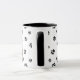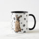 Um lindo Cachorro Malinois belga olha para você de dois lados desta caneca. O texto entre as duas imagens diz: "No oitavo dia, Deus criou a BELGA MALINOIS e a chamou de MUITO BOA". As imagens do cão e o banner branco oval que contém os campos de texto são colocados sobre um fundo branco com impressões de pata preta.