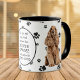 Um lindo Cocker Spaniel loiro olha para você de dois lados desta caneca. O texto entre as duas imagens diz "No dia 8, Deus criou o COCKER SPANIEL e o chamou de MUITO BOM". As imagens do cão e o banner branco oval que contém os campos de texto são colocados sobre um fundo branco com impressões de pata preta.