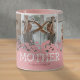 Uma caneca moderna para a mãe apresentando uma colagem fotográfica das crianças, um design de coração rosa giro, o ditado "nós te amamos mãe", e os nomes das crianças.
