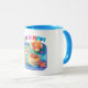 Este doce e pensativo design de caneca apresenta uma bandeja de café da manhã ao estilo cartoon com uma pilha de panquecas perfuradas com xarope, um copo de suco de laranja com palha, e uma nota que lê "Café da Manhã na Cama para a Mãe" com um pequeno coração vermelho. A bandeja também é decorada com corações coloridos e formas de estrelas, e adoráveis flores sorridentes. Acima da bandeja, as palavras "LOVE U MOM" são reproduzidas em letras coloridas em blocos tridimensionais. Esta design de caneca captura maravilhosamente o gesto de um café da manhã especial para o Dia de as mães, fazer-a como um presente de dia de as mães e uma linda caneca de dia de as mães.