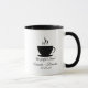 Um simples design preto e branco com uma xícara de café a vapor e "a mistura perfeita". Adicione seus nomes e a data do casamento a este moderno jogo minimalista de café, pedido dois para Sr. e Sra.