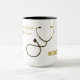 Num fundo de cor branca, a imagem de um estetoscópio de cor preta a dourada. À esquerda da caneca, coloca-se o texto "Os melhores médicos dão o mínimo" e à direita a palavra MEDICINA num ouro como a cor. Um belo presente para todos os médicos entre nós, para presentes especiais, podem visitar nossos CREATORS NÓS ESTAMOS aqui no ZAZZLE.