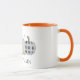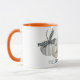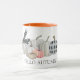Alô, citação do outono em uma linda caneca com dentro e alça cor de laranja, e uma variedade fofa de abóboras decoradas. Bombas de aquarela moderna em laranja branco e esticadas.