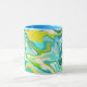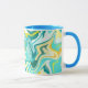 Este design contém um padrão de abstrato com formas fluidas, semelhantes a ondas, em tons brilhantes de turquesa, lacre, amarelo e verde. A composição sugere um senso de movimento e energia, evocando elementos naturais como ondas do oceano ou água fluindo.