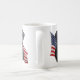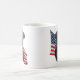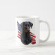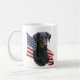 Um Pinscher preto de Dobermann com as orelhas naturais (uncropped) na frente de uma bandeira americana de ondulação em uma caneca.