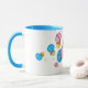 Tasse mit bunten Ostereiern und frühlingshaften Gänseblümchen.