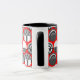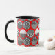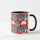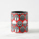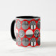 Esta caneca tem um design geométrico de ovais com diferentes padrões em cinzas em cada metade, num campo vermelho.