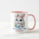Desenho adorável de um coelho branco com grandes olhos azuis segurando um ovo azul de Páscoa. A mensagem "Ovo Azul Coelho" é escrita em uma fonte azul correspondente sob a imagem, e [NOME AQUI] é escrita em rosa correspondente sob ela. Você pode personalizar qualquer uma ou ambas as mensagens para se adequar ao seu gosto. Disponível em vários tamanhos de xícara e estilos. Você também pode mudar a alça e/ou a cor da caneca dentro.