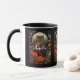 A mug with a cool looking owl with a piercing stare. A full moon in the back with a garden of red flowers.
