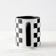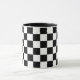 A caneca na moda apresenta um padrão ousado, preto e branco, feito de filas de quadrados brancos e negros alternados como em uma bandeira de corrida. A caneca tem uma alça preta e interior que você pode personalizar na barra lateral.
