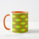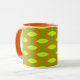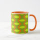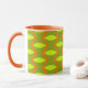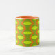 Um padrão legal de ovais verde amarelo claro e listras verticais laranja curvas em um fundo verde