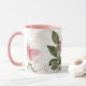 Esta linda caneca tem um lindíssimo padrão floral vintage de flores rosa e folhas verdes contra um fundo desfocado.
