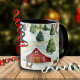 Uma cena de inverno com eterno clássico, cor d'água, com casas e celeiros em uma colina com árvores de abeto durante o inverno!