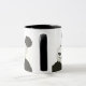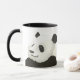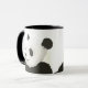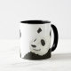 Caneca branca com dois Pandas em volta da área da imagem. O fundo é branco e a xícara é dentro preto, com uma alça preta. O Panda está pintado.