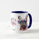 A característica desta caneca única é uma imagem aquosa de um Bulldog francês embrulhado numa bandeira americana e vestindo óculos de sol vermelhos. A imagem está em dois lados da caneca, com estrelas e listras e seu texto personalizado entre elas.
