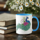 Pavão com flor fuchsia lotus e hena num pano de fundo azul claro