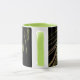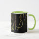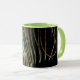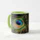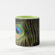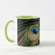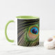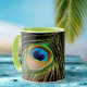 Caneca de café elegante com uma pena de pavão glamourosa sobre fundo preto.
