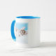 Um filhote de rouco deitado num cobertor branco com um aspecto de sono num fundo azul.