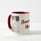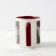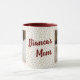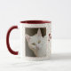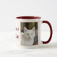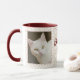 Caneca personalizada para mãe de gato com duas imagens personalizadas, um padrão decorativo de marcas de patas marrons claras no fundo e texto marrom escuro com o nome da mãe do gato no meio. Caneca divertida e personalizada para uma senhora que ama gatos e se identifica como mãe de gato.