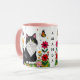 A sweet personalized coffee cup with a cute illustration of a black and white cat surrounded by flowers and butterflies in a paper quilling impasto style.
