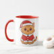 Celebrate the season or a special achievement with this adorable customizable two-tone mug. The design features a charming, happy cartoon kitten dressed in a Santa Claus outfit (hat and coat), radiating holiday cheer. On the reverse side, a festive message reads "Congratulations! May your holidays be merry & bright!" with a space below to personalize it with a name or short message, making it a truly unique keepsake. The mug features a vibrant red interior and handle, contrasting beautifully with the white exterior. It's the perfect size for coffee, tea, or cocoa, and makes an excellent gift for cat lovers, coworkers, or family members to mark a special occasion during the holiday season.