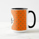 Funny Halloween mug featuring flying witch on orange polka dot background.