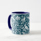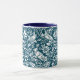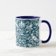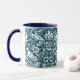 Mug em um William Morris, design de papel de parede Art Nouveau de faisões e lebres entre folhas, videiras e flores - branco sutilmente texturizado sobre fundo azul-denim/indigo