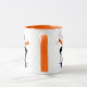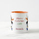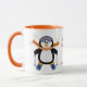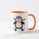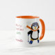 Esta caneca fofa apresenta um adorável pinguim esquiador de neve e seu próprio texto personalizado. O pinguim está vestido com um cachecol laranja e óculos azuis, e está se movendo em seus esquis. Alguns flocos de neve se movem ao seu redor. A imagem é repetida duas vezes, com três campos de texto para o texto personalizado entre eles. Festivo e brilhante!