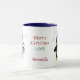 Esta caneca de Natal apresenta um pinguim de desenho animado bonitinho em um cachecol listrado azul e um chapéu azul de inverno. Ele é carregando de uma cana doce listrada vermelha e branca amarrada com um arco verde. Alguns flocos de neve se movem ao seu redor. A imagem é repetida em cada lado, com três campos de texto para o texto personalizado entre eles. Perfeito para crianças grandes e pequenas durante a época de Natal! Não se esqueça de ver as outras canecas do tema do pinguim de Natal na nossa loja.