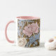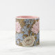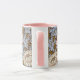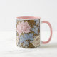 Uma caneca de café floral com crisântemos cor-de-rosa e branco a partir de um padrão restaurado digitalmente por William Morris (1834-1896), o designer têxtil britânico do período das artes e artesanatos.