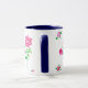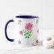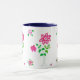 Uma bonito caneca branca com lábio e punho azul escuro e um design floral rosa e verde que imita a aplicação ou a colagem, de uma colagem de papel pintada à mão por Judy Adamson.