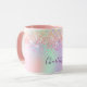 Um fundo holográfico de tendência com cores pastel unicórnio e arco-íris cor rosa, púrpura, rosa, verde de menta. Decorado com pó de brilho falso. Personalize e adicione um nome, escrito com um moderno script de estilo escrito à mão.