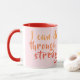 Uma caneca de café rosa-cristã com texto do livro dos Philippians, "Eu posso fazer tudo através de Cristo que me fortalece". A redação está em tons de laranja e vermelho impresso sobre rosa pálido. Vermelho é a cor do sotaque na alça e dentro na xícara - ou troque-a. Faz um belo presente para a mulher cristã.