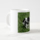 Filhote de Pomerânia Preta e Branca brincando na grama