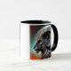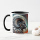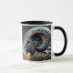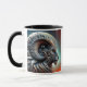 Un bélier majestueux se tient de profil, sa tête tournée vers l’horizon, avec des cornes magnifiquement enroulées et décorées de motifs fluides. Sa crinière stylisée mélange des vagues et des lignes qui semblent bouger, comme si le vent les caressait. Les couleurs sont douces mais intenses, avec des nuances de bleu, gris, rouille et blanc. Ce design unique mélange force et élégance, avec une touche artistique moderne. L’image donne une sensation de calme puissant, comme un symbole de nature, de sagesse et de détermination. Chaque détail attire l’œil, et l’ensemble évoque une illustration forte et poétique, parfaite pour les amateurs de figures animales stylisées et de créations originales.