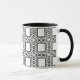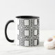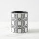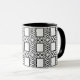 Esta caneca preto e branco elegante, decorativa caracteriza um teste padrão abstrato ornamentado do curlicue que cerca quadrados centrais.