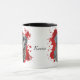 Um belo retrato de cor de água de um Labrador Retriever preto se destaca contra um fundo brilhante de pintura de abstrato vermelho. A imagem está em dois lados da caneca, com seu nome ou outro texto personalizado a preto entre eles.