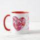 Primeira caneca da Escritura Corinthians 13:4 -7 com corações maiores e padrões e pequenos corações cor-de-rosa.