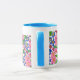 Uma caneca branca e de boa qualidade com jante azul e alça. O design floral pintado à mão é de primatas cor-de-rosa e azuis e o texto à volta do topo diz: "Uma caneca especial para uma mãe especial. Lavadora de louça e micro-ondas seguras. Veja também placas de saudação, presentes e roupa.