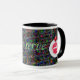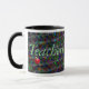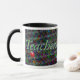 Um conceito original e trabalho de arte por ZoeSPEAK preenche esta Mug em apreço aos professores - um design de logotipo original, e um slogan para os professores que lê "Professores servem COMIDA PARA PENSAMENTO". As palavras "Professores ao serviço" encontram-se em caracteres itálicos verde de maçã, que permitem ilustrar uma placa branca de janto com as palavras "COMIDA PELO PENSAMENTO" em letras vermelhas, curvas para encher o centro do prato. No topo da placa está uma maçã vermelha brilhante com uma folha verde e outra maçã no canto inferior esquerdo da caneca. O fundo da caneca é um padrão colorido, principalmente cinza-escuro, mas espalhado por toda parte com vermelhos, azuis e verdes. As letras do alfabeto, em bonés e minúsculas, mais os números de zero a nove rodam diagonalmente em branco puro sobre o fundo.