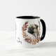 Uma bonito coroa de outono em tons de cinamão marrom, bronzeado, e creme rodeando a imagem aquática de um adorável Cachorro Pug. A imagem é impressa duas vezes na caneca, com seu texto personalizado entre eles.