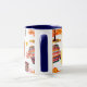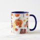 Fall/Autumn Mug - as cores são azul, laranja, amarela, marrom e branca. A xícara é uma montagem de outono de suéteres, folhas, abóboras, botas e árvores.