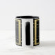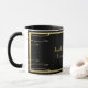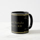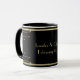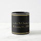 Esta caneca caracteriza um fundo preto, e seu texto (aqui, um nome dos casais e um casamento datam,) em um quadro do ouro com redemoinhos do ouro, com um olhar gravado.