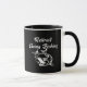 Aposentado! Indo Pescar. Texto branco com um peixe branco prestes a morder a isca num gancho.